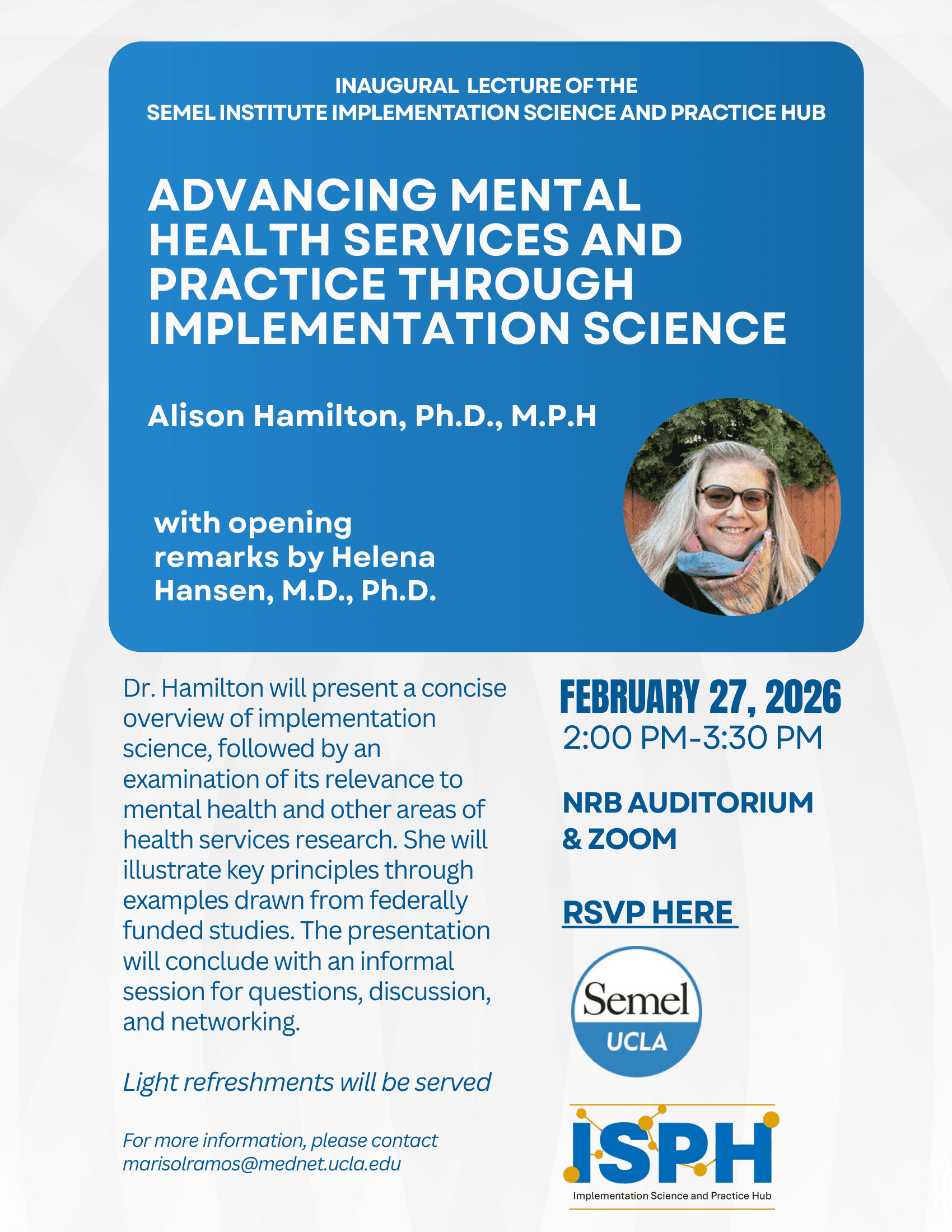 Please join us on Friday, February 27, 2026 from 2-3:30pm at the NRB Auditorium or via Zoom. Dr. Alison Hamilton will be presenting her talk “Advancing Mental Health Services and Practice through Implementation Science”.