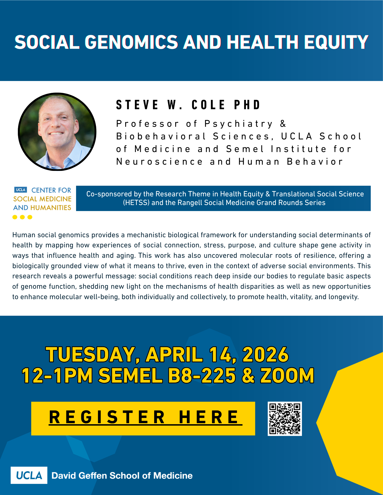 Please join us on Tuesday, April 14, 2026 from 12-1pm at Semel B8-225 or Zoom for a talk by Dr. Steve W. Cole entitled “Social Genomics and Health Equity”.